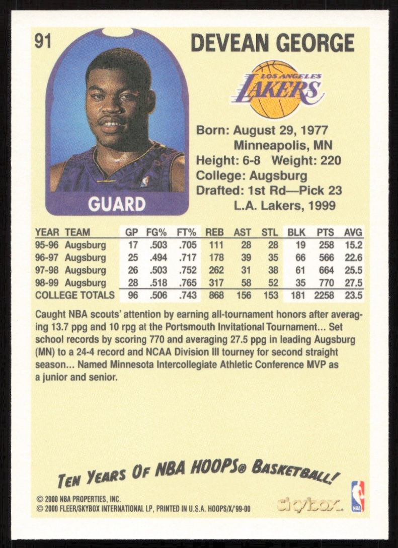 This Basketball card, from 1999-00 is part of the Skybox NBA Hoops Decade card set. Devean George is featured and has a card number of 91.