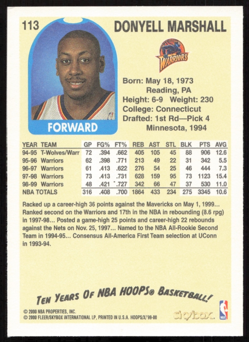 This Basketball card, from 1999-00 is part of the Skybox NBA Hoops Decade card set. Donyell Marshall is featured and has a card number of 113.