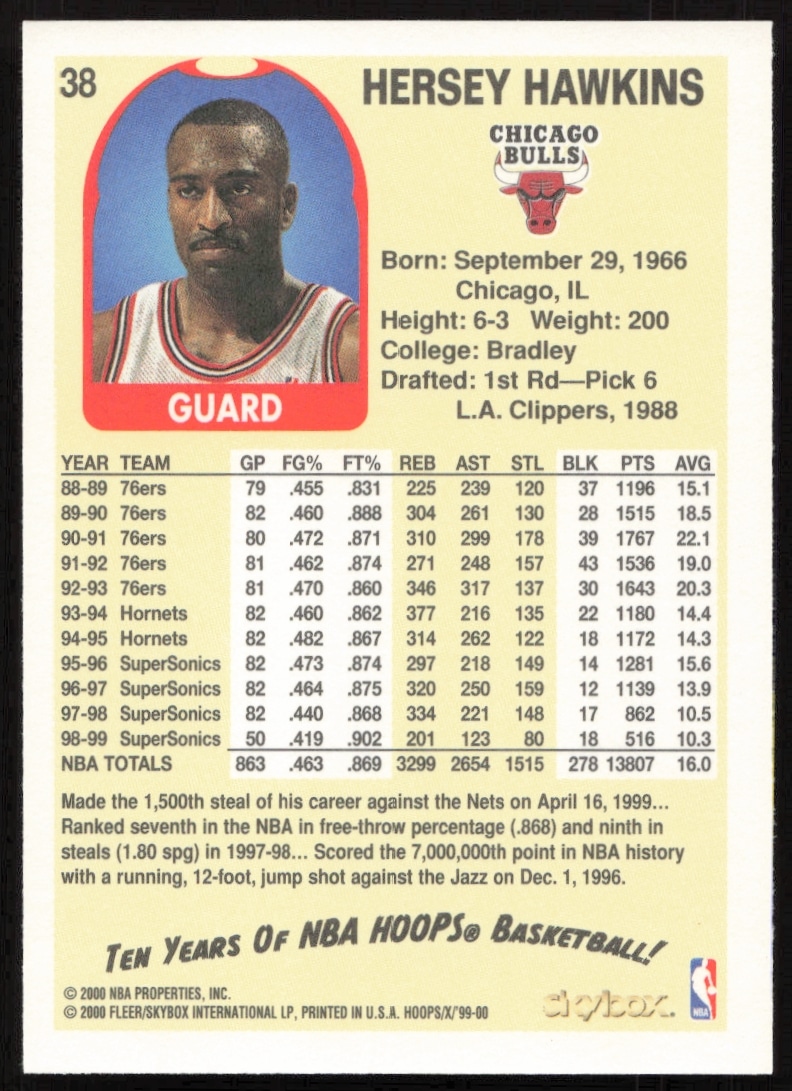 This Basketball card, from 1999-00 is part of the Skybox NBA Hoops Decade card set. Hersey Hawkins is featured and has a card number of 38.