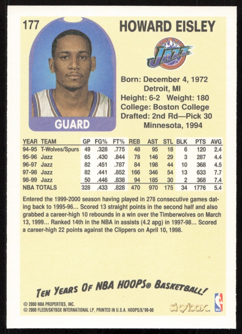 This Basketball card, from 1999-00 is part of the Skybox NBA Hoops Decade card set. Howard Eisley is featured and has a card number of 177.