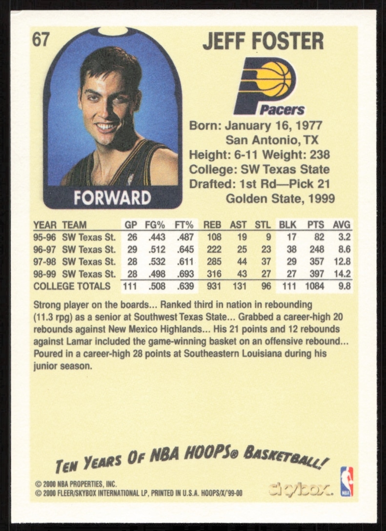 This Basketball card, from 1999-00 is part of the Skybox NBA Hoops Decade card set. Jeff Foster is featured and has a card number of 67.