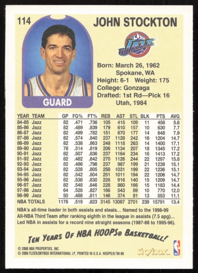 This Basketball card, from 1999-00 is part of the Skybox NBA Hoops Decade card set. John Stockton is featured and has a card number of 114.
