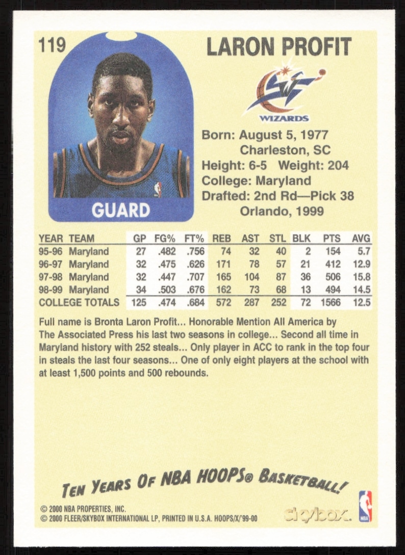 This Basketball card, from 1999-00 is part of the Skybox NBA Hoops Decade card set. Laron Profit is featured and has a card number of 119.