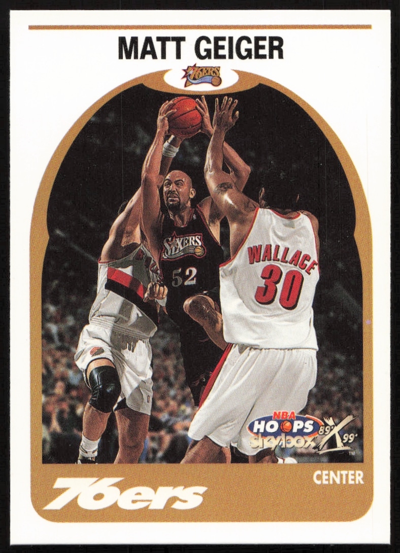 This Basketball card, from 1999-00 is part of the Skybox NBA Hoops Decade card set. Matt Geiger is featured and has a card number of 156.