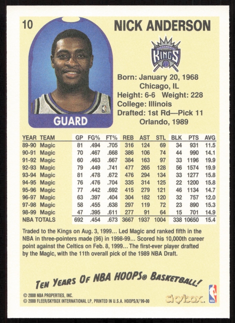 This Basketball card, from 1999-00 is part of the Skybox NBA Hoops Decade card set. Nick Anderson is featured and has a card number of 10.
