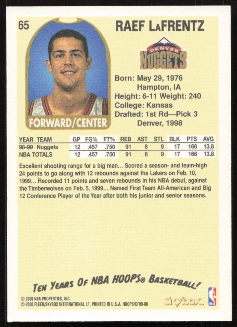 This Basketball card, from 1999-00 is part of the Skybox NBA Hoops Decade card set. Raef LaFrentz is featured and has a card number of 65.