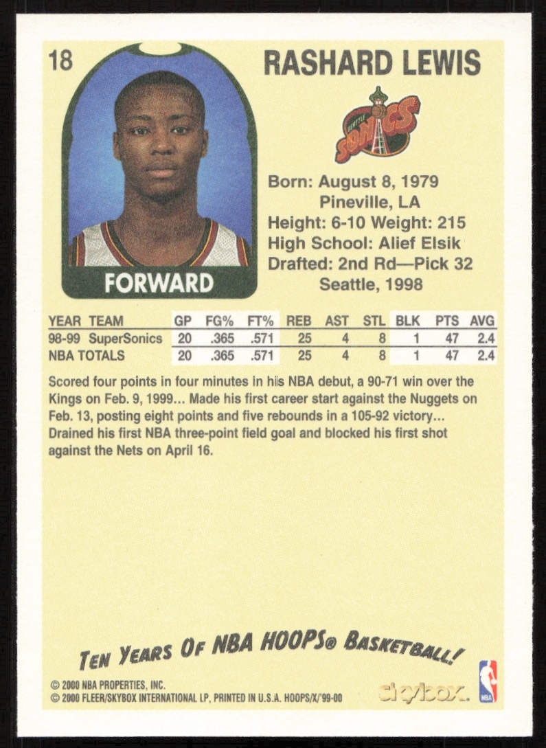 This Basketball card, from 1999-00 is part of the Skybox NBA Hoops Decade card set. Rashard Lewis is featured and has a card number of 18.