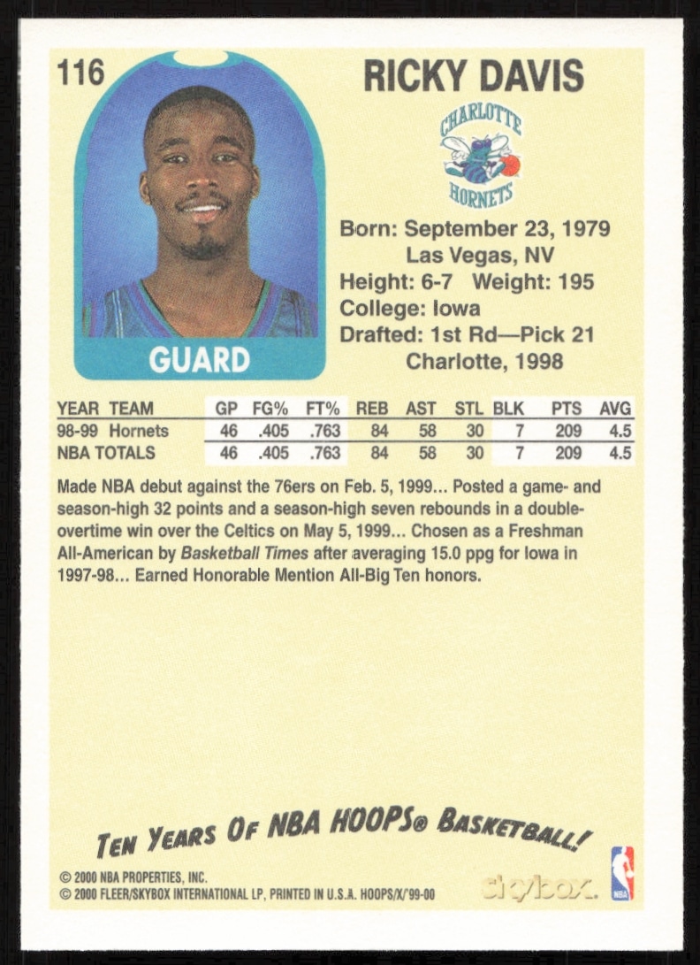 This Basketball card, from 1999-00 is part of the Skybox NBA Hoops Decade card set. Ricky Davis is featured and has a card number of 116.