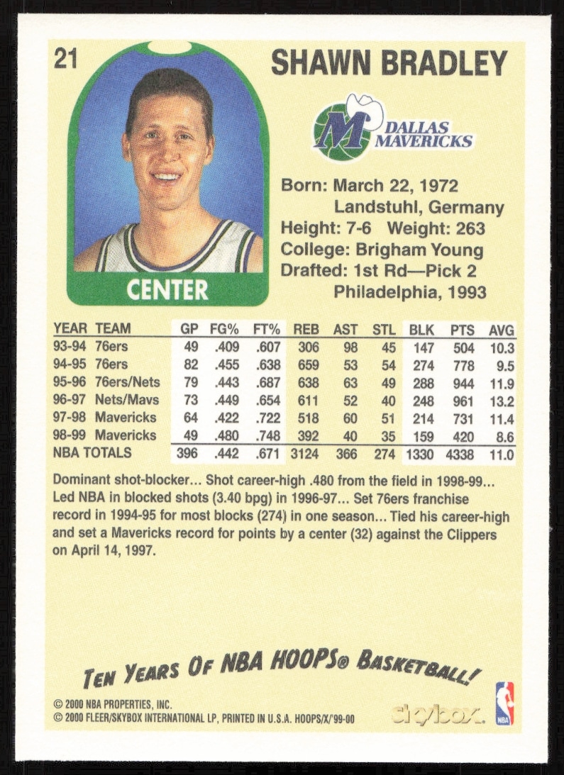 This Basketball card, from 1999-00 is part of the Skybox NBA Hoops Decade card set. Shawn Bradley is featured and has a card number of 21.