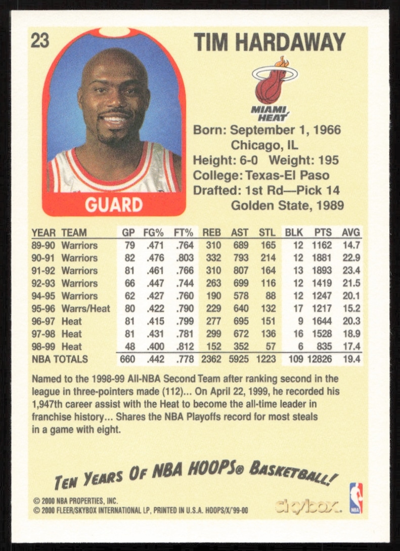 This Basketball card, from 1999-00 is part of the Skybox NBA Hoops Decade card set. Tim Hardaway is featured and has a card number of 23.
