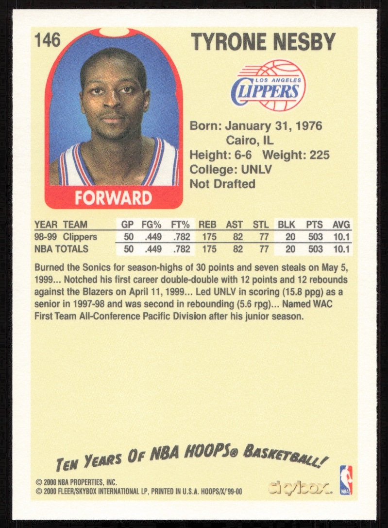 This Basketball card, from 1999-00 is part of the Skybox NBA Hoops Decade card set. Tyrone Nesby is featured and has a card number of 146.