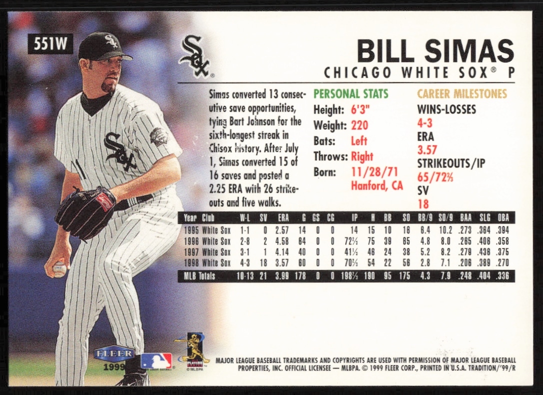 This Baseball card, from 1999 is part of the Fleer card set. Bill Simas is featured and has a card number of 551W.