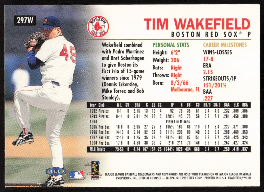 This Baseball card, from 1999 is part of the Fleer card set. Tim Wakefield is featured and has a card number of 297W.