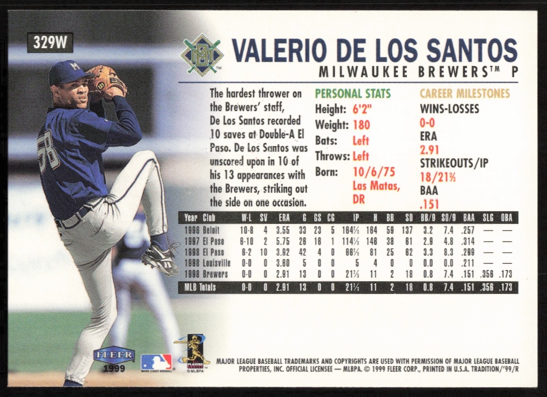 This Baseball card, from 1999 is part of the Fleer card set. Valerio De Los Santos is featured and has a card number of 329W.