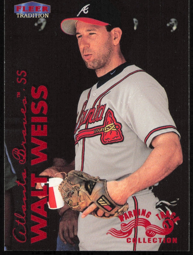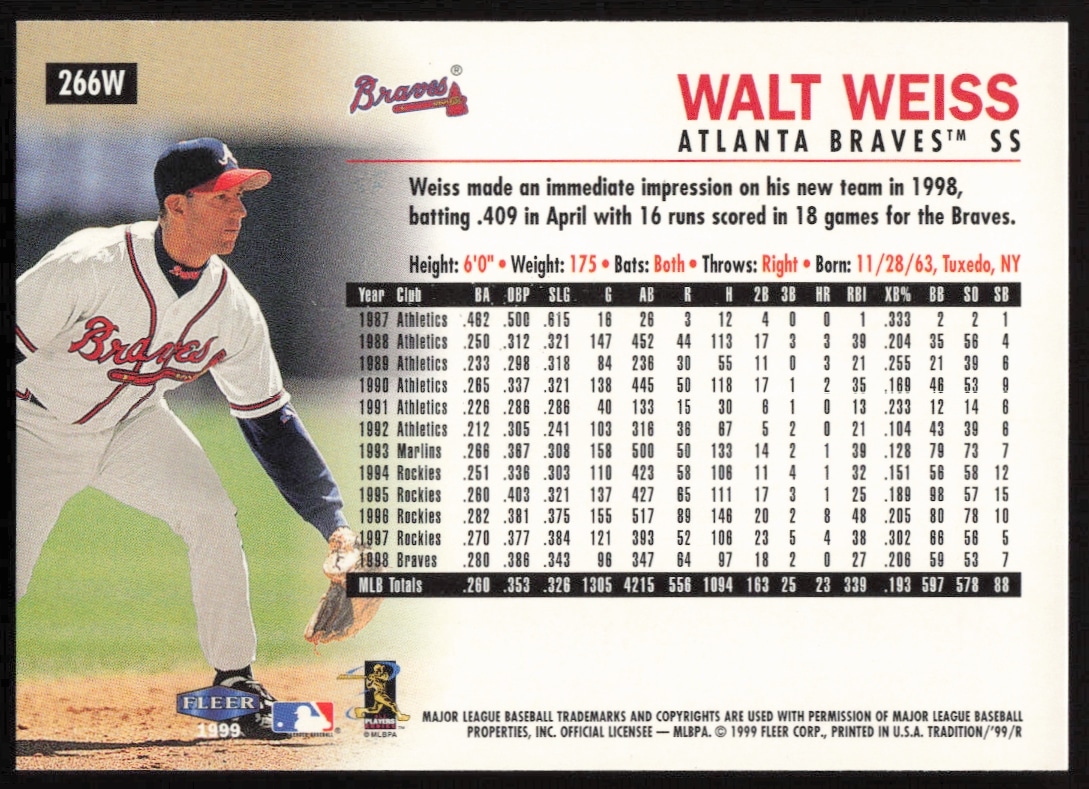 This Baseball card, from 1999 is part of the Fleer card set. Walt Weiss is featured and has a card number of 266W.