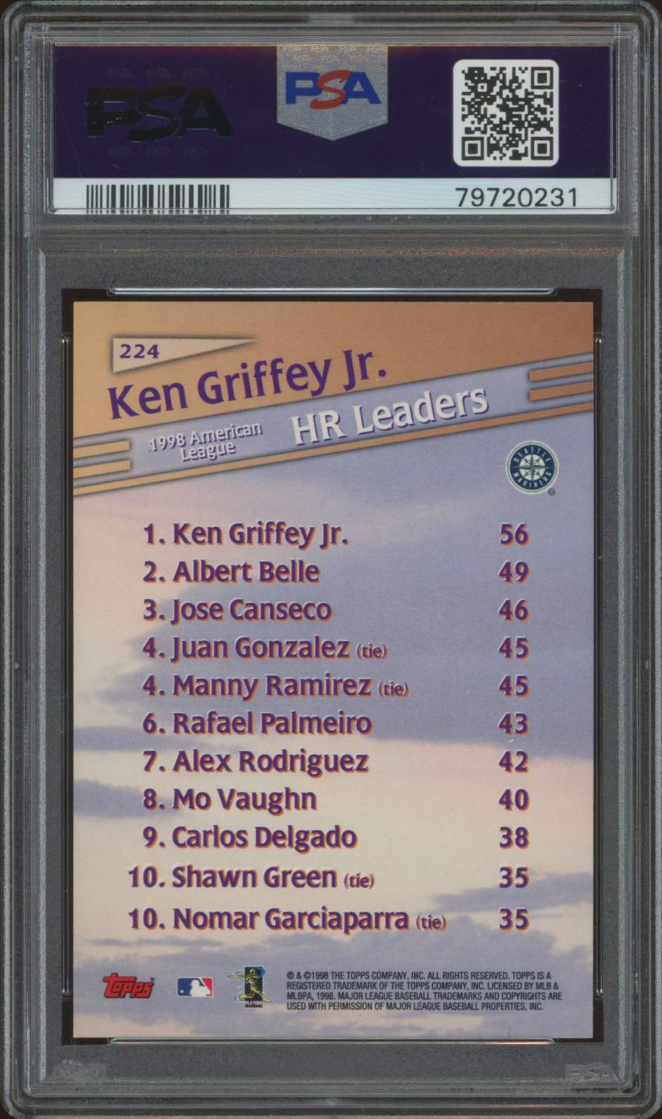 Overall, I’d definitely recommend the 1999 Topps Ken Griffey Jr. League Leaders #224 (PSA 9) to fellow collectors. Whether you’re a dedicated Griffey fan, a vintage card enthusiast, or simply looking to add a valuable piece to your collection, this card delivers quality and visual appeal. It’s an authentic, well-preserved collectible that’s sure to bring enjoyment and value over time.