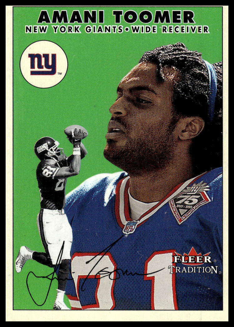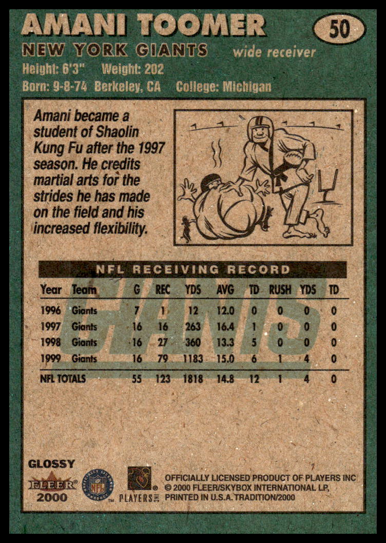 This Football card, from 2000 is part of the Fleer Tradition Glossy card set. Amani Toomer is featured and has a card number of 50.