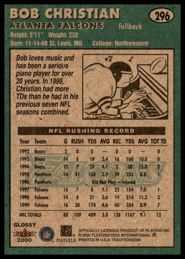 This Football card, from 2000 is part of the Fleer Tradition Glossy card set. Bob Christian is featured and has a card number of 296.