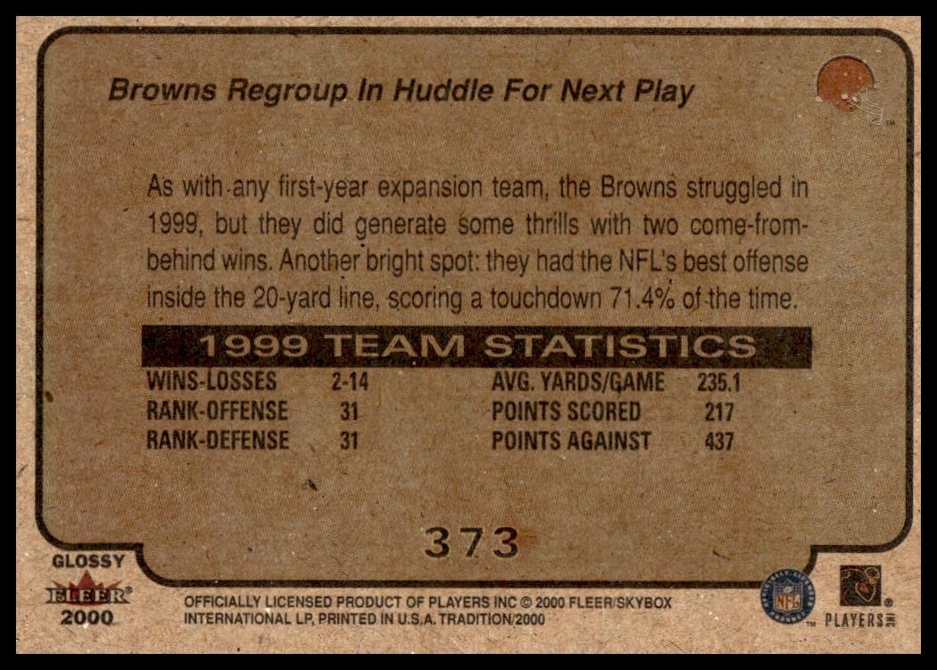 This Football card, from 2000 is part of the Fleer Tradition Glossy card set. Browns Regroup in Huddle for Next Play is featured and has a card number of 373.