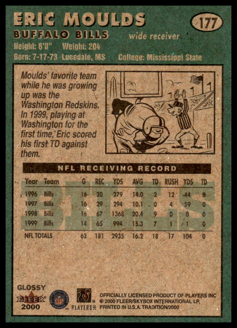 This Football card, from 2000 is part of the Fleer Tradition Glossy card set. Eric Moulds is featured and has a card number of 177.