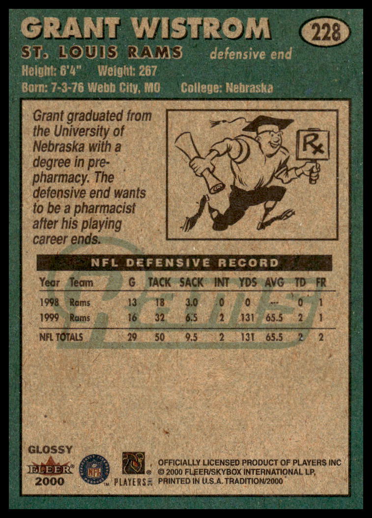This Football card, from 2000 is part of the Fleer Tradition Glossy card set. Grant Wistrom is featured and has a card number of 228.