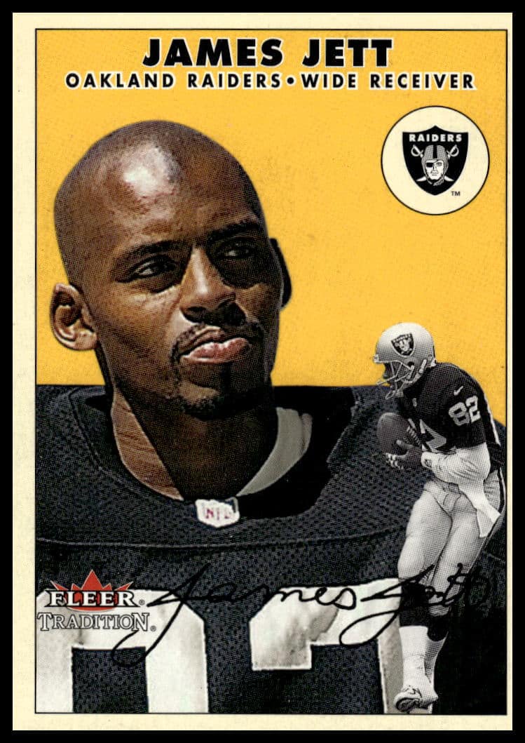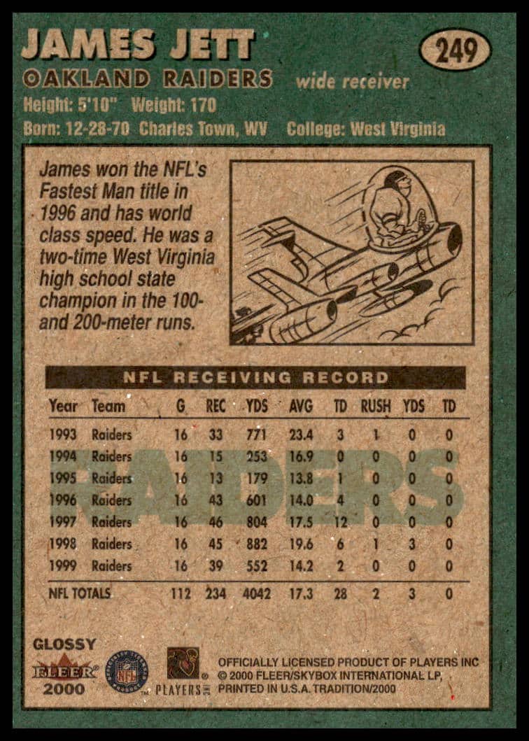 This Football card, from 2000 is part of the Fleer Tradition Glossy card set. James Jett is featured and has a card number of 249.