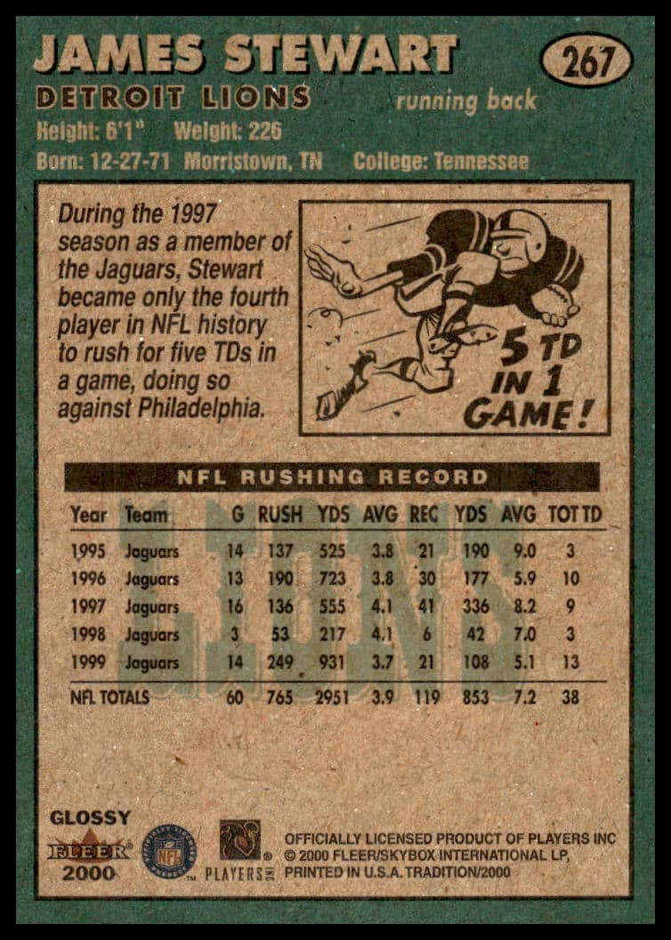 This Football card, from 2000 is part of the Fleer Tradition Glossy card set. James Stewart is featured and has a card number of 267.