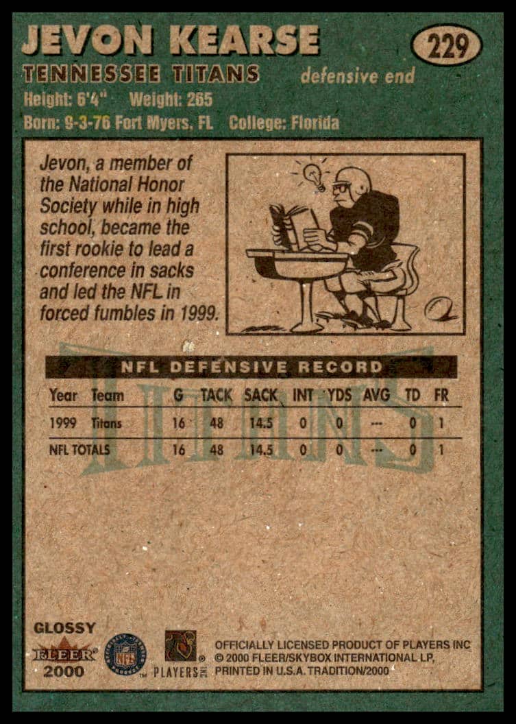 This Football card, from 2000 is part of the Fleer Tradition Glossy card set. Jevon Kearse is featured and has a card number of 229.