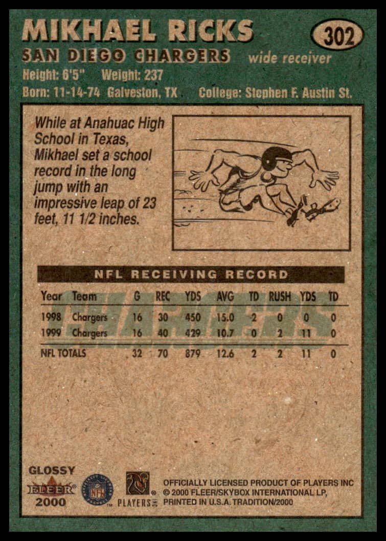 This Football card, from 2000 is part of the Fleer Tradition Glossy card set. Mikhael Ricks is featured and has a card number of 302.