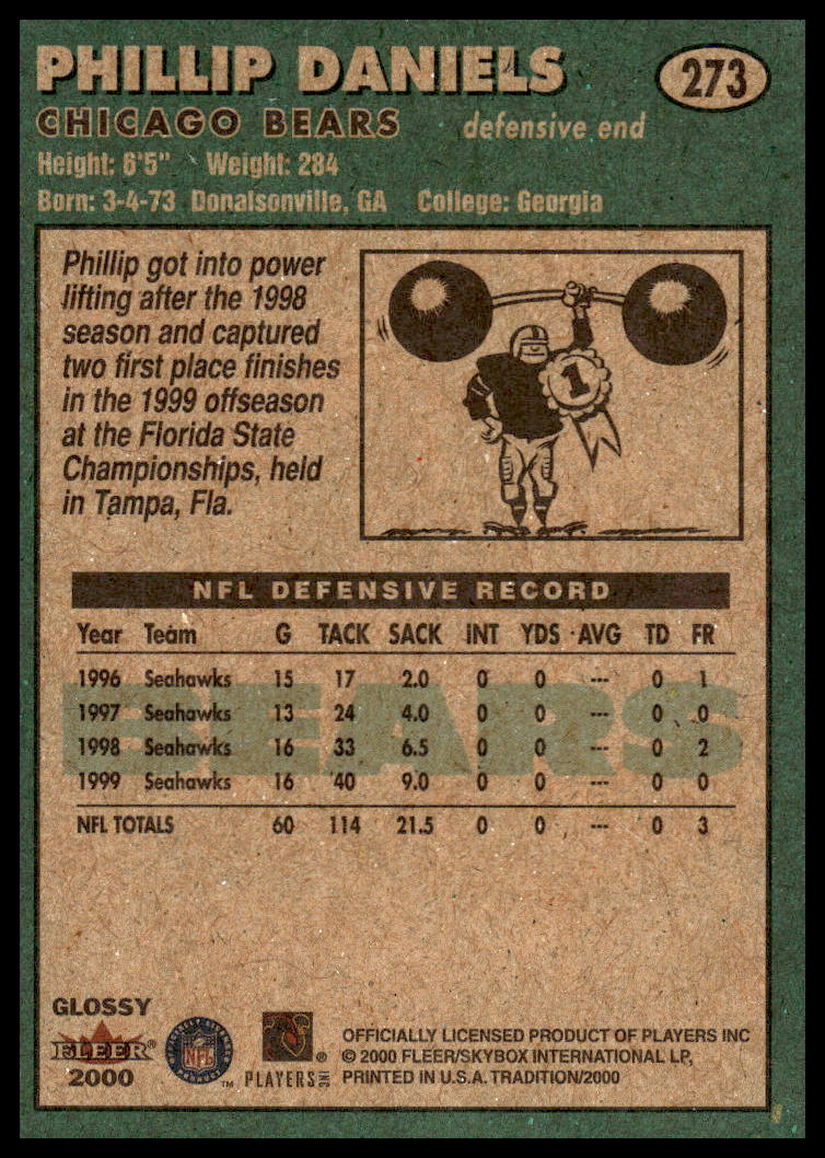 This FootballΒ card, from 2000 is part of the Fleer Tradition GlossyΒ card set. Phillip Daniels is featured and has a card number of 273.