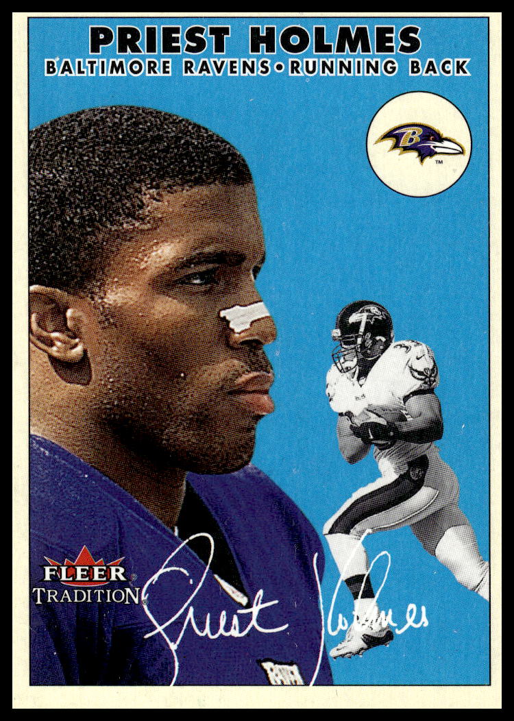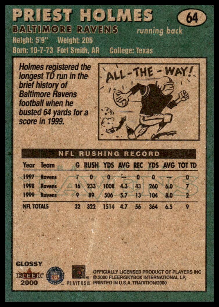 This FootballΒ card, from 2000 is part of the Fleer Tradition GlossyΒ card set. Priest Holmes is featured and has a card number of 64.