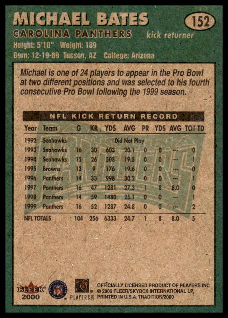 This Football card, from 2000 is part of the Fleer Tradition card set. Michael Bates is featured and has a card number of 152.
