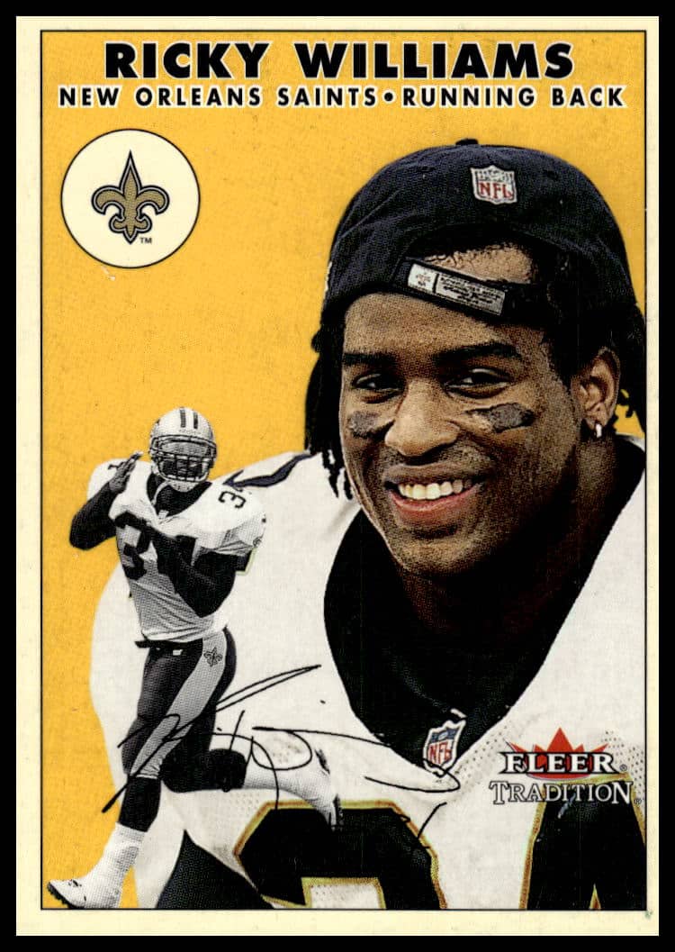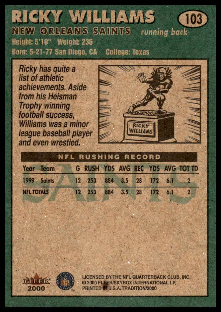 This Football card, from 2000 is part of the Fleer Tradition card set. Ricky Williams is featured and has a card number of 103.