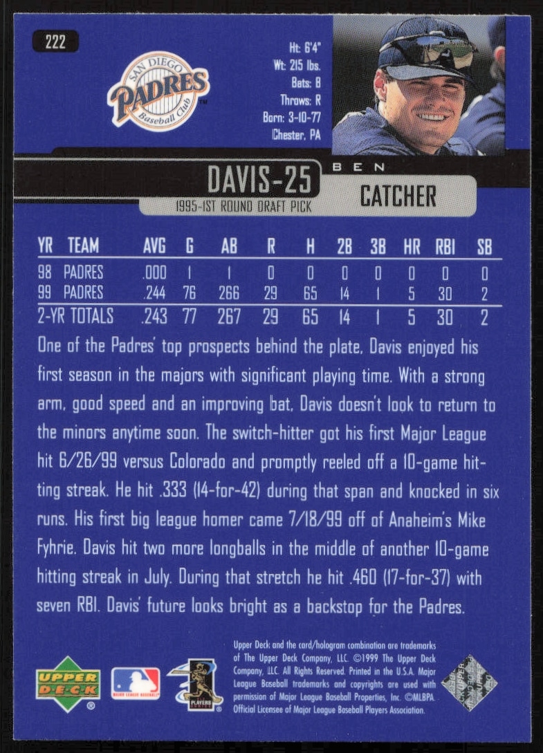 This Baseball card, from 2000 is part of the Upper Deck card set. Ben Davis is featured and has a card number of 228.
