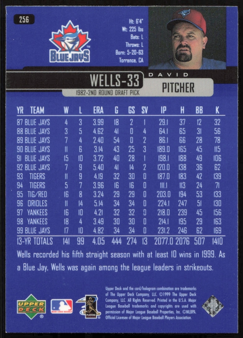 This Baseball card, from 2000 is part of the Upper Deck card set. David Wells is featured and has a card number of 256.