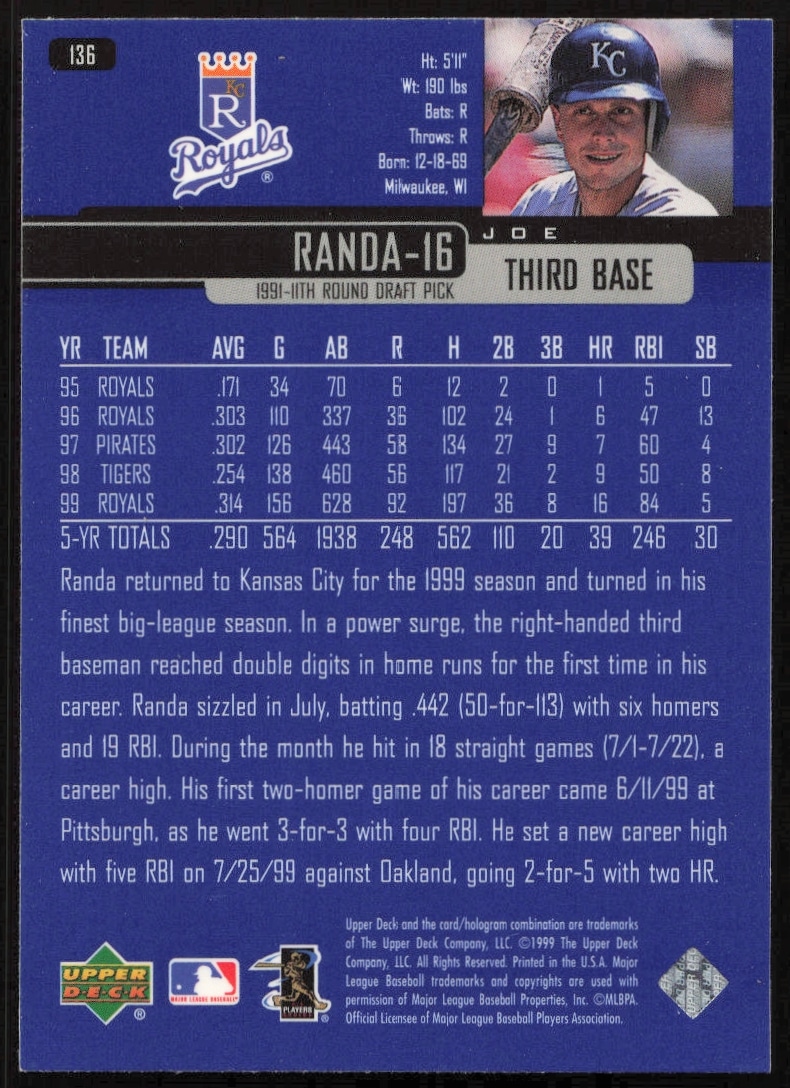 This Baseball card, from 2000 is part of the Upper Deck card set. Joe Randa is featured and has a card number of 136.