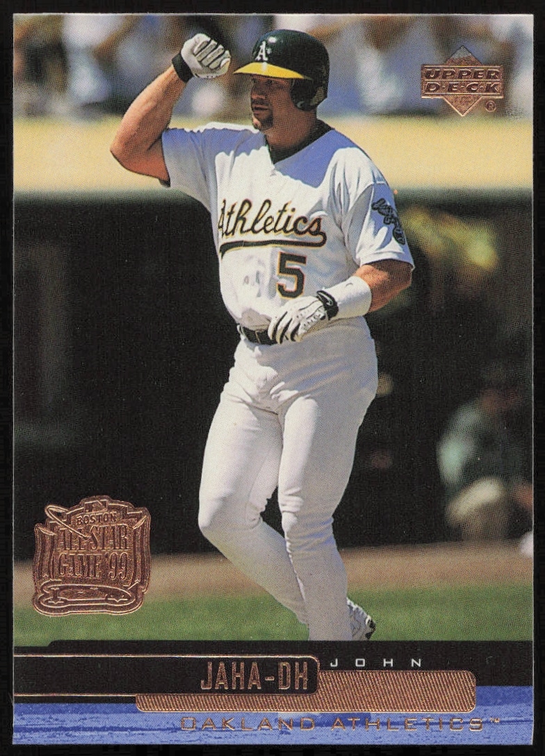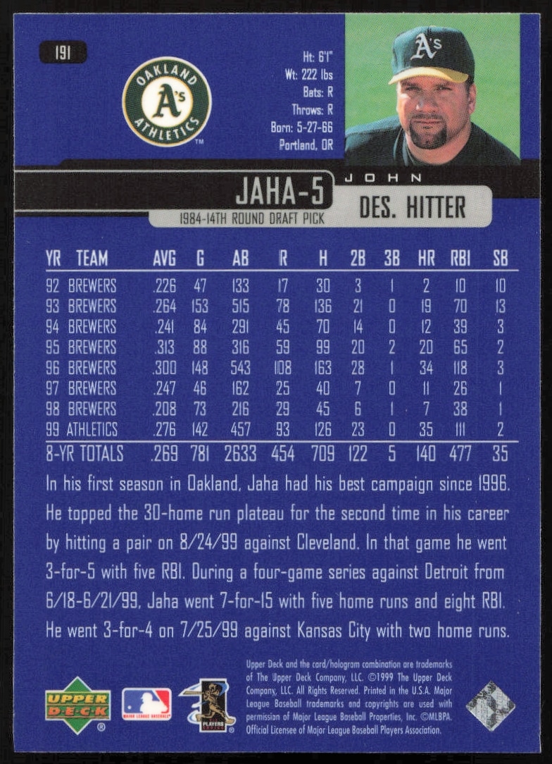This Baseball card, from 2000 is part of the Upper Deck card set. John Jaha is featured and has a card number of 191.