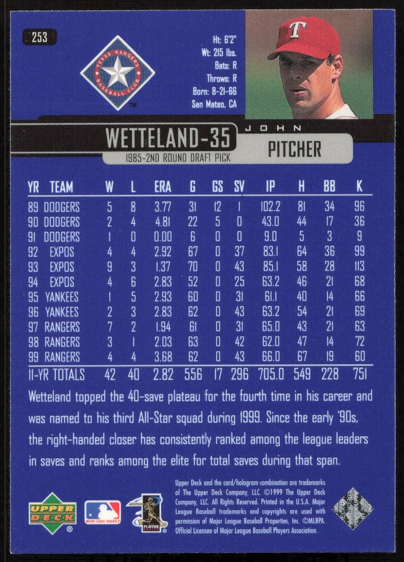 This Baseball card, from 2000 is part of the Upper Deck card set. John Wetteland is featured and has a card number of 253.