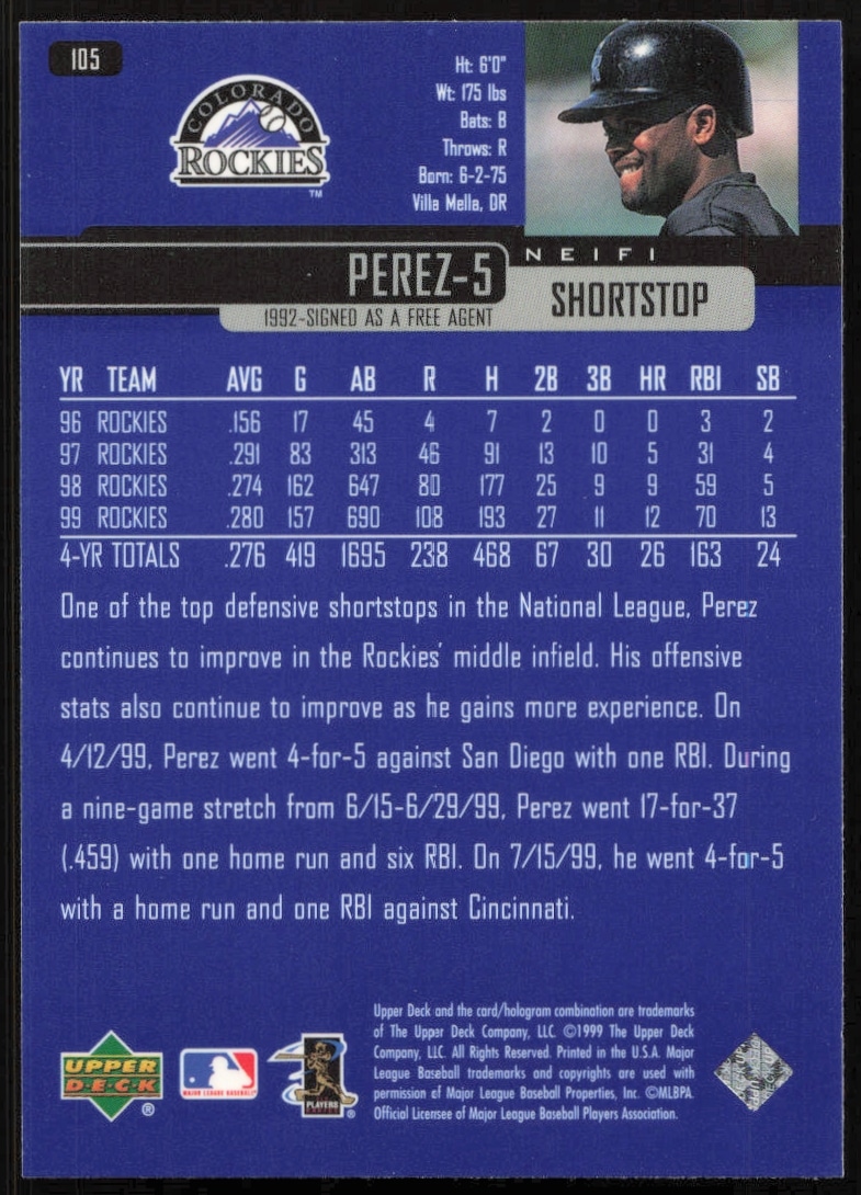 This Baseball card, from 2000 is part of the Upper Deck card set. Neifi Perez is featured and has a card number of 105.