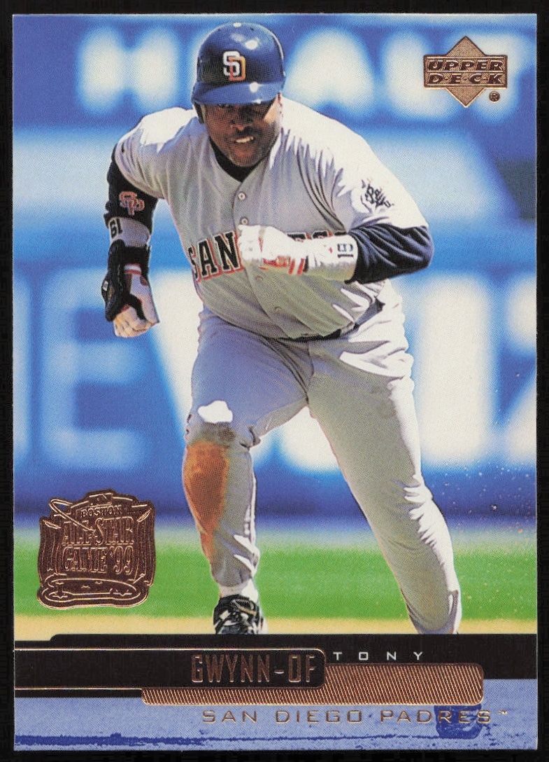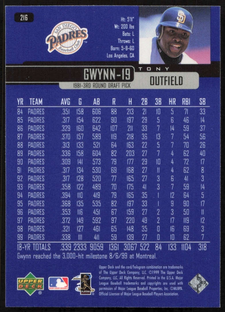 This Baseball card, from 2000 is part of the Upper Deck card set. Tony Gwynn is featured and has a card number of 216.