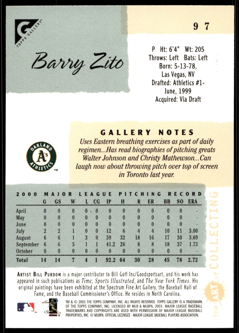 This Baseball card, from 2001 is part of the Topps Gallery card set. Barry Zito is featured and has a card number of 97.