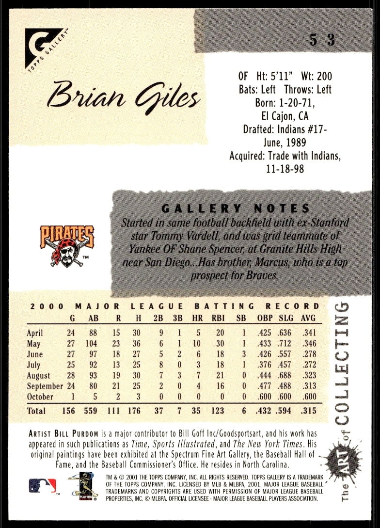 This Baseball card, from 2001 is part of the Topps Gallery card set. Brian Giles is featured and has a card number of 53.