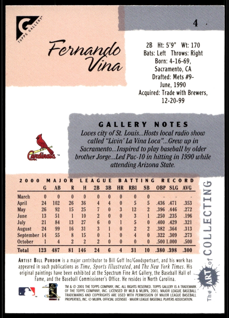 This Baseball card, from 2001 is part of the Topps Gallery card set. Fernando Vina is featured and has a card number of 4.