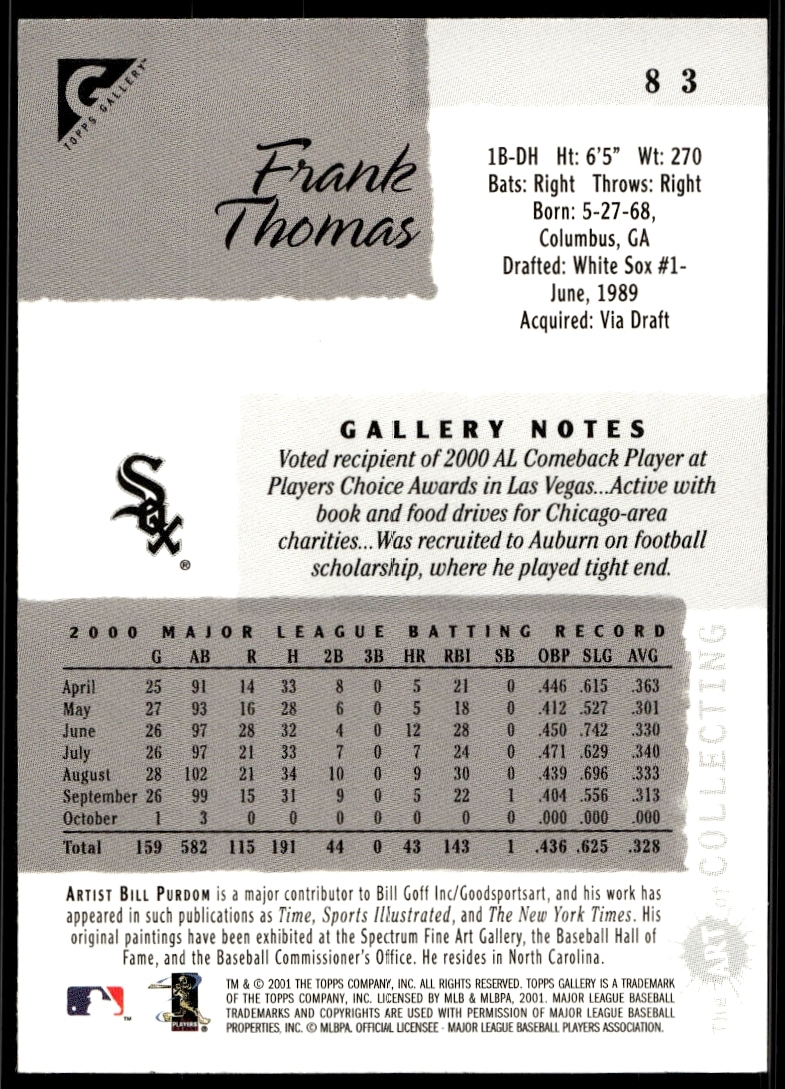This Baseball card, from 2001 is part of the Topps Gallery card set. Frank Thomas is featured and has a card number of 83.