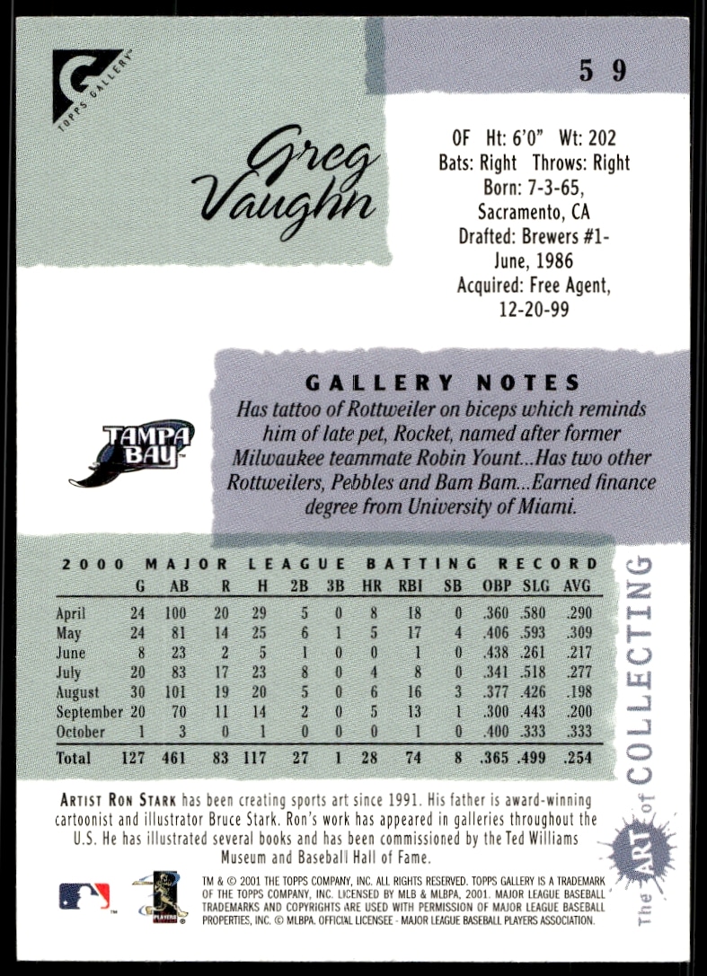 This Baseball card, from 2001 is part of the Topps Gallery card set. Greg Vaughn is featured and has a card number of 59.