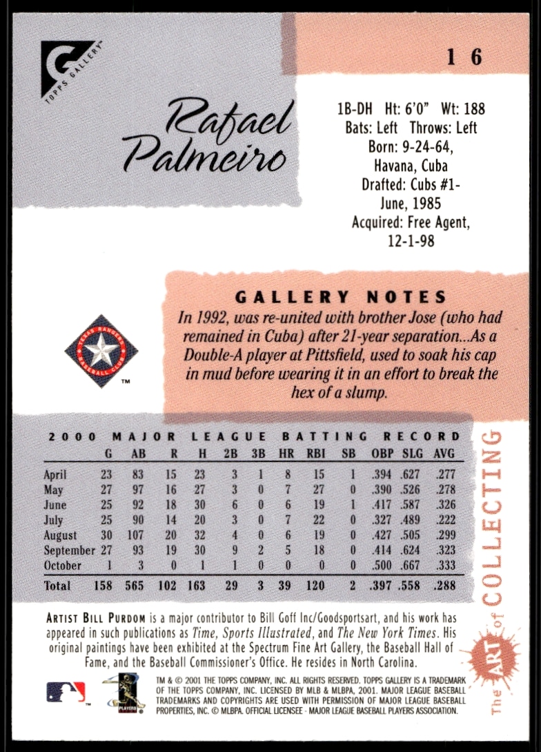 This Baseball card, from 2001 is part of the Topps Gallery card set. Rafael Palmeiro is featured and has a card number of 16.