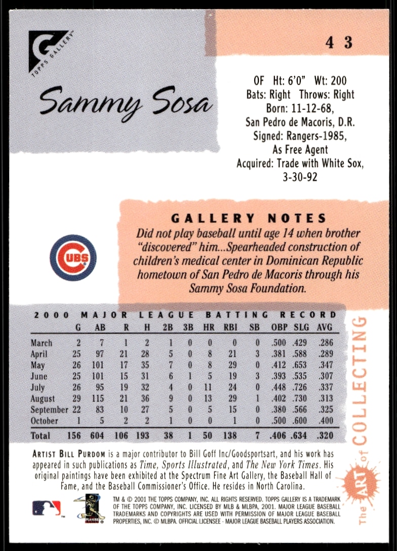 This Baseball card, from 2001 is part of the Topps Gallery card set. Sammy Sosa is featured and has a card number of 43.