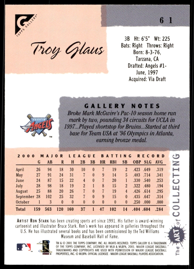 This Baseball card, from 2001 is part of the Topps Gallery card set. Troy Glaus is featured and has a card number of 61.