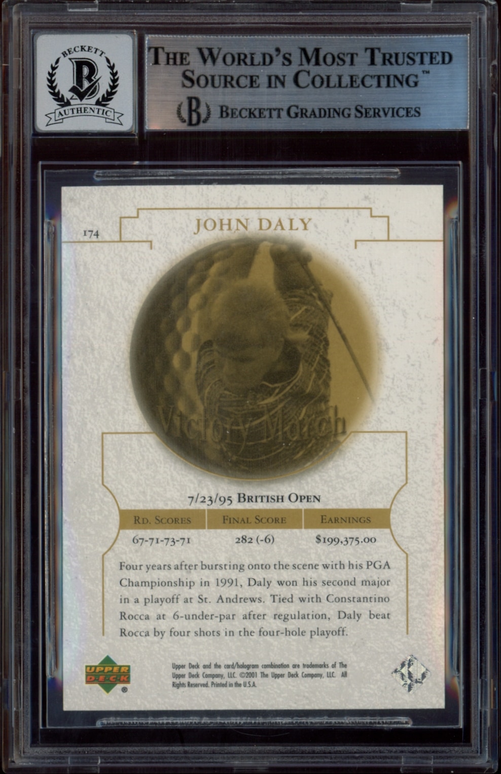 This Golf card, from 2001 is part of the Upper Deck  card set. John Daly is featured and has a card number of 174. It is graded by BAS and has a numeric grade of 10.