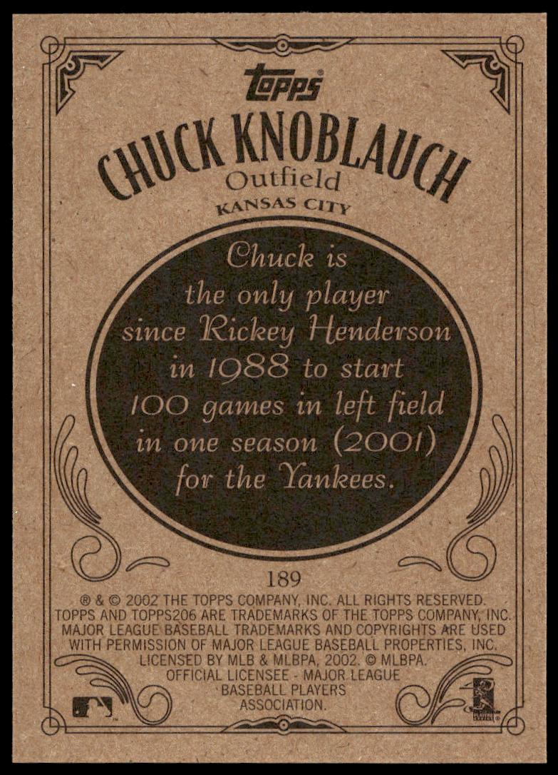 This BaseballΒ card, from 2002 is part of the Topps 206Β card set. Chuck Knoblauch is featured and has a card number of 189.